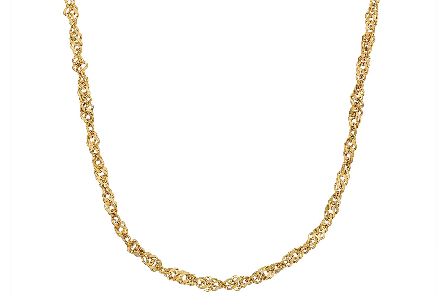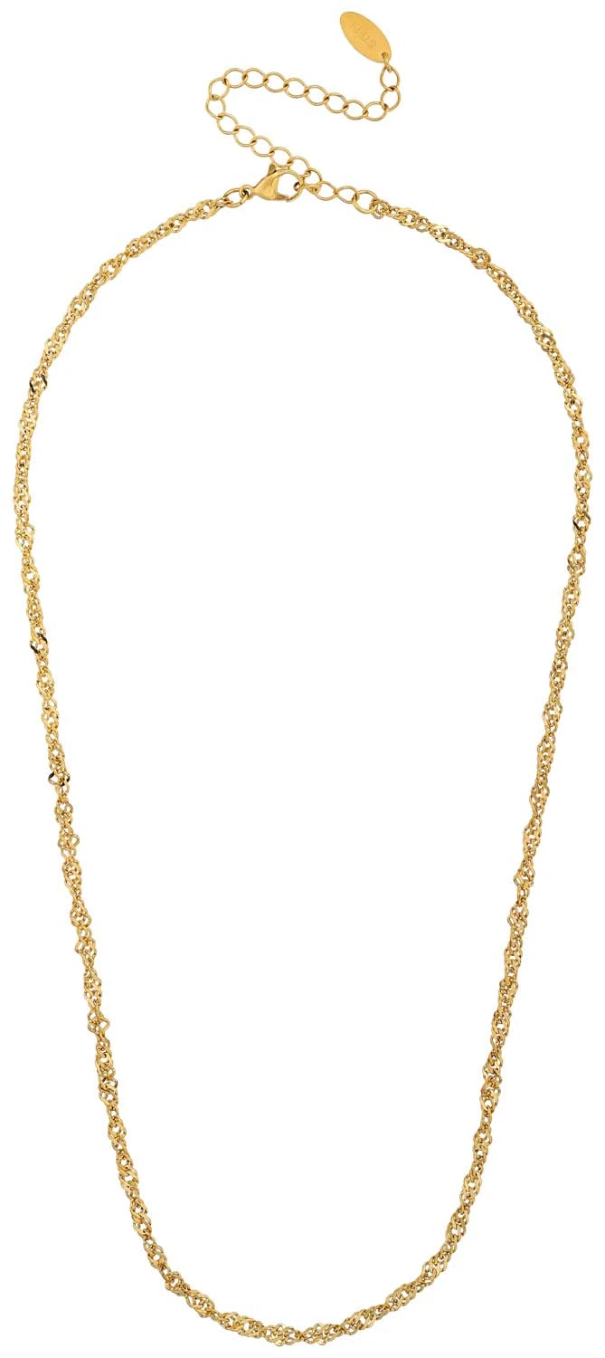 Die Kette – Golden Twirl schimmert goldfarben und besteht aus Edelstahl. Die Kette hat enge Glieder und eine gedrehte Optik. Durch die Verlängerungskette lässt sich die Kette individuell einstellen. Das perfekte, klassische Accessoire!