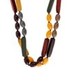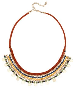 Die Kette – Good Vibes schimmert in fröhlichen Farben, sie hat bunte Perlen, goldfarbene Anhänger in Kreisform und ein geflochtenes Stoffelement.