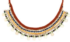 Die Kette – Good Vibes schimmert in fröhlichen Farben, sie hat bunte Perlen, goldfarbene Anhänger in Kreisform und ein geflochtenes Stoffelement.
