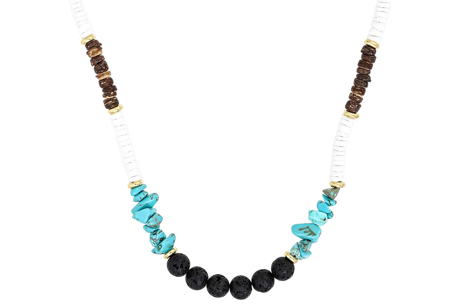 Die Kette – Harsh Ocean ist mehrfarbig und besteht aus echten Edelsteine. Die Edelsteine sind TĂĽrkise und Lavasteine. Die Kette ist ebenfalls mit Muscheln und Holzperlen geschmĂĽckt.