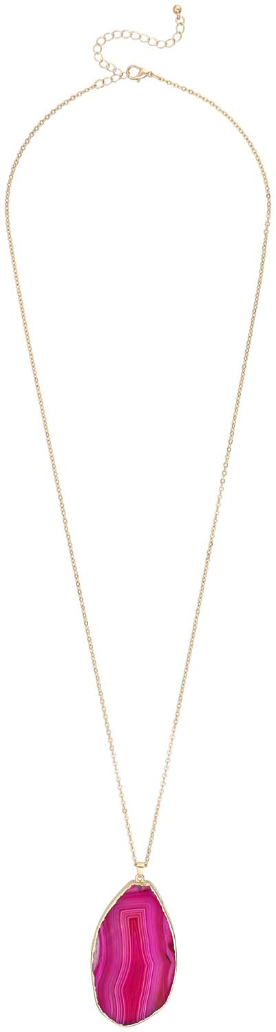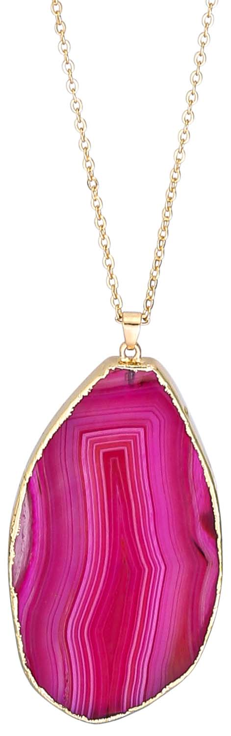 Die Kette – Hot Agate schimmert goldfarben und ist mit einem ovalen Anhänger verziert. Der Anhänger ist pink und besteht aus dem echten Edelstein Achat. Die Gliederkette besitzt eine Verlängerungskette.