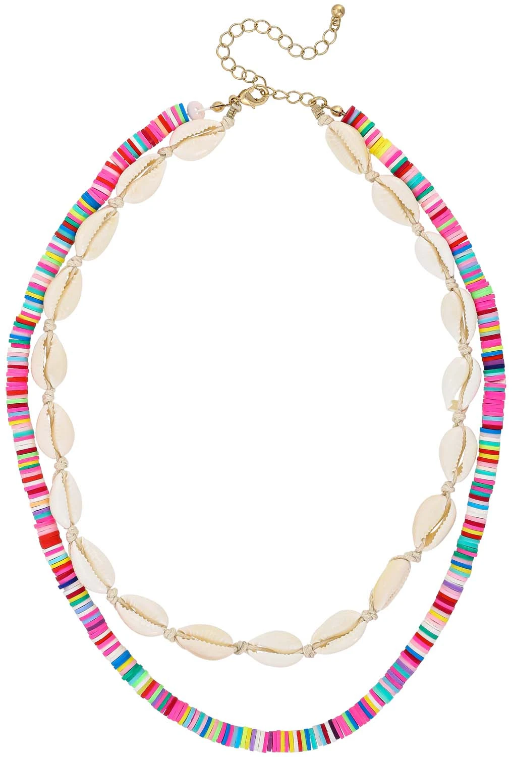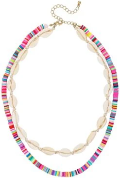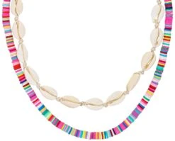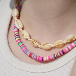 Die Kette – Joyful Colours besteht aus einer Reihe Muschelkette und einer Reihe Perlenkette aus Kunststoffperlen in vielen bunten Farben. Die Kette hat eine Verlängerungskette.
