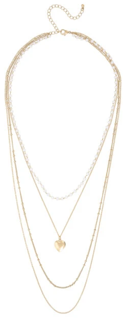 Die Kette – Layering Heart in der Farbe Gold besteht aus Gliederketten und einer Perlenkette in WeiĂź. Ein Amulett in Herzform schmĂĽckt diese Kette.