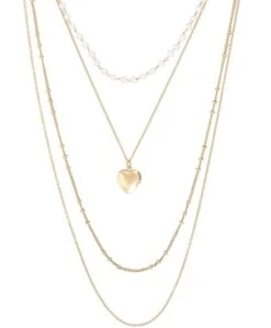 Die Kette – Layering Heart in der Farbe Gold besteht aus Gliederketten und einer Perlenkette in WeiĂź. Ein Amulett in Herzform schmĂĽckt diese Kette.
