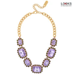Die Kette – Lilac Statement glänzt goldfarben und ist mit Strasssteinen in unterschiedlichen Farben und Formen verziert. Die Strasssteine sind grĂĽn und lila. Die Kette ist ein richtiges Statement und ist aus der LOOKS by Wolfgang Joop Kollektion.