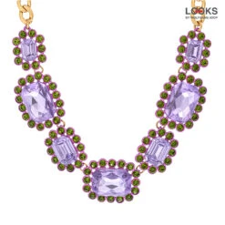 Die Kette – Lilac Statement glänzt goldfarben und ist mit Strasssteinen in unterschiedlichen Farben und Formen verziert. Die Strasssteine sind grĂĽn und lila. Die Kette ist ein richtiges Statement und ist aus der LOOKS by Wolfgang Joop Kollektion.
