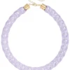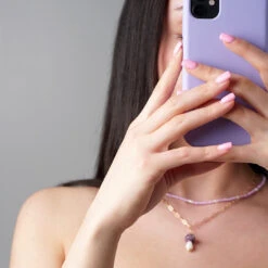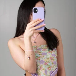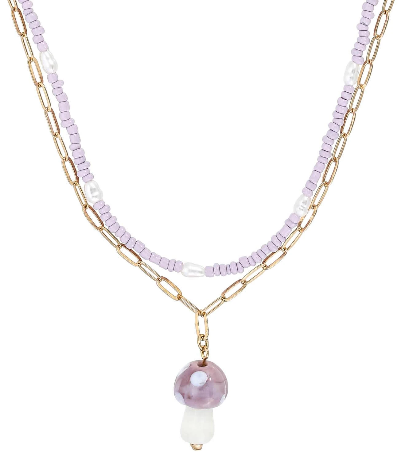 Die Kette – Lucky Pearls ist eine zweireihige Kette mit einer Reihe lilafarbener Perlenkette und einer Reihe goldfarbener Gliederkette. An der Gliederkette befindet sich ein lilafarbener Fliegenpilz-Anhänger.