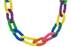 Die Kette – Magical Colours besteht aus vielen pinken Glasperlen, die ineinander verflochten sind. Die Glasperlen bilden einzelne Glieder, welche miteinander zusammenhängen und somit einer Ankerkette ähneln. Die Kette ist ein wahres Statement Accessoire und zieht alle Blicke auf sich.