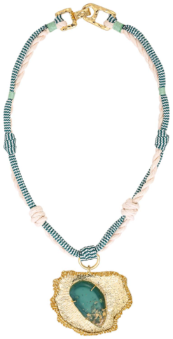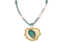 Die Kette – Maritim Stone besteht aus einem Textilband, welches grĂĽn und beige ist. Die Kette hat einen Anhänger in einer asymmetrischen Form. In der Mitte des Anhängers ist ein Stein, welcher grĂĽn und goldfarben ist.