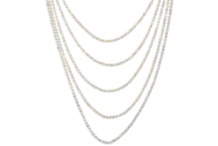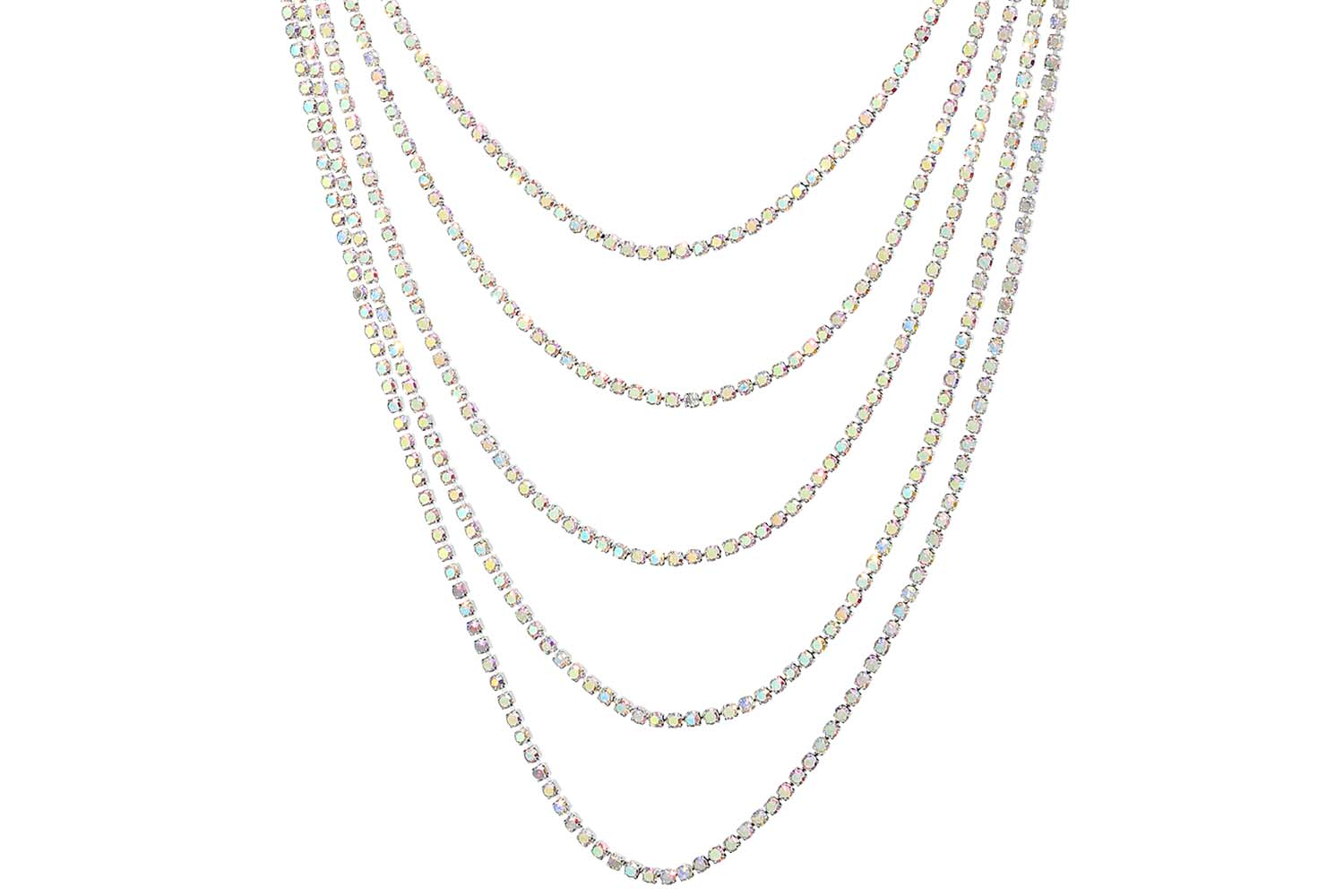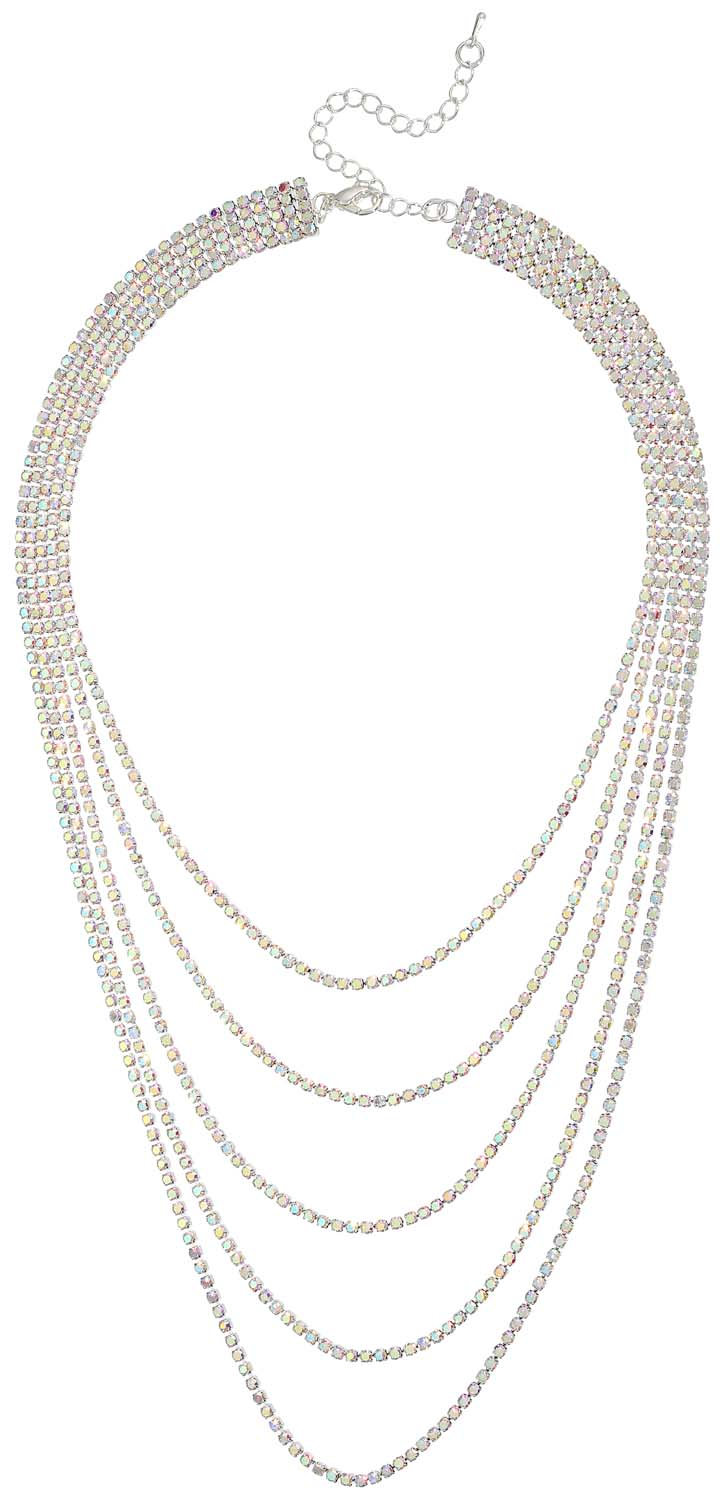 Die Kette – Multi Row ist silberfarben und besteht aus mehreren zusammengehörigen Reihen, die unterschiedlich lang sind. Alle Reihen sind mit Strasssteinen besetzt, welche in Regenbogenfarben schimmern.