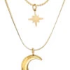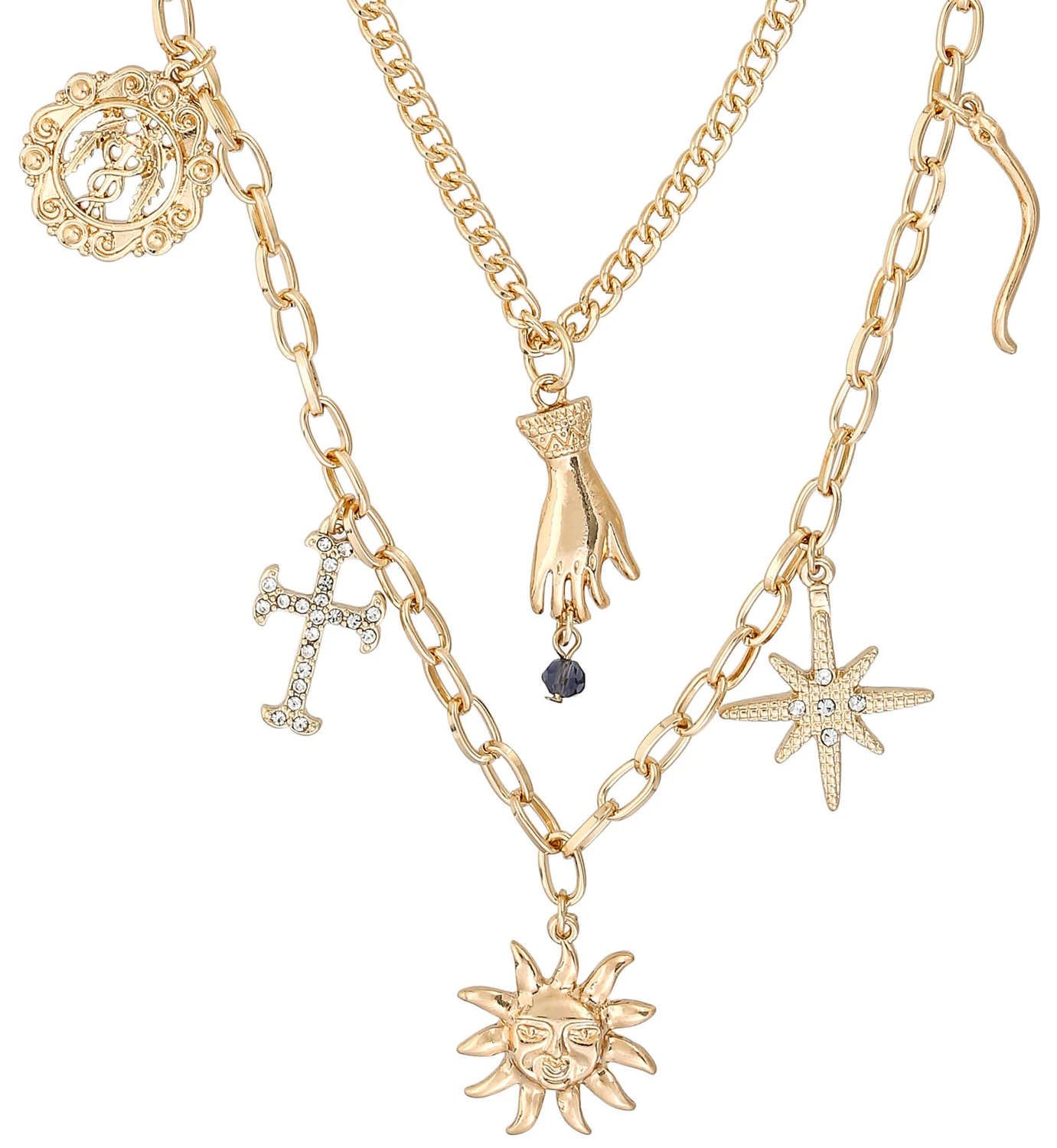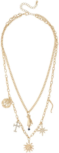 Die Kette – Mystic Sun funkelt in Goldfarben und besteht aus zwei Gliederketten im Layering-Look. Die Kette wird von sieben Anhängern verziert.