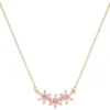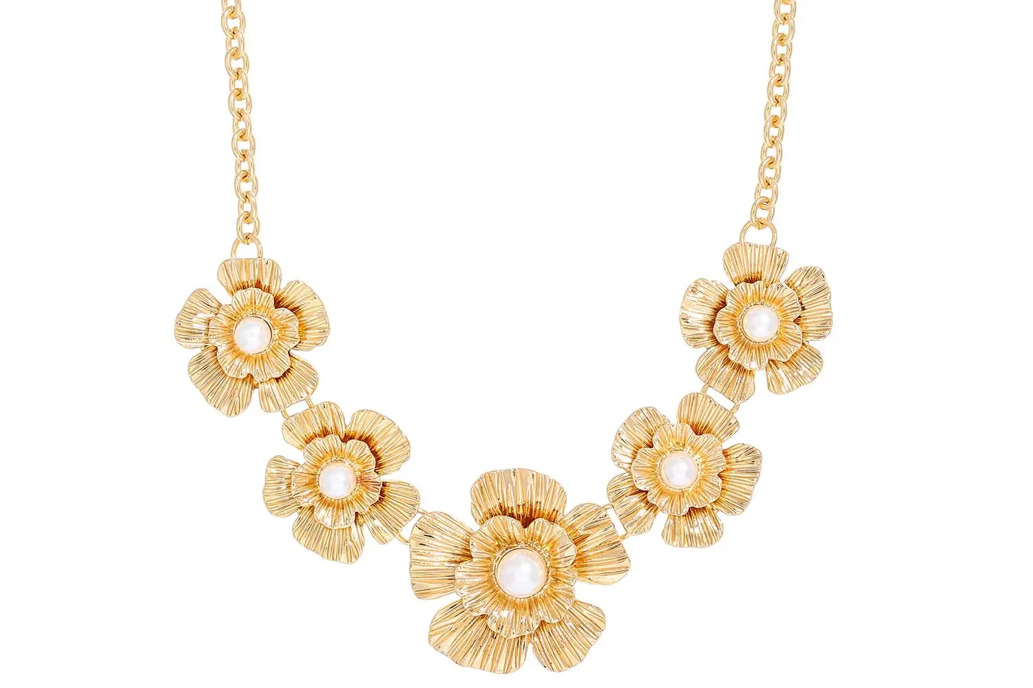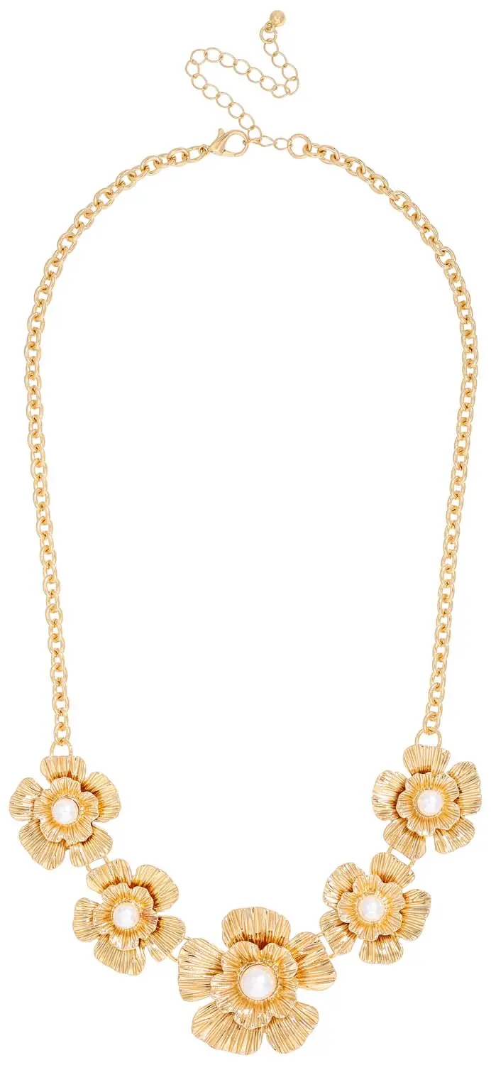Die Kette – Pearl Flower schimmert goldfarben und besteht aus fĂĽnf Blumen in unterschiedlichen Größen. Die Blumen sind mit jeweils einer Kunstperle in der Mitte verziert.