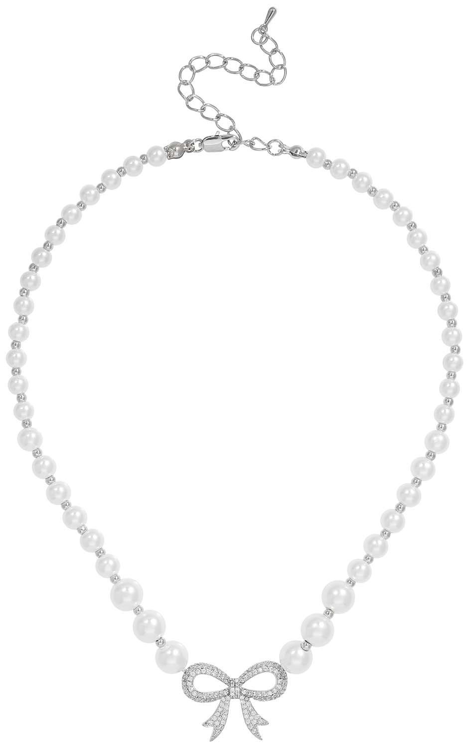 Die Kette – Pearly Bow schimmert silberfarben und ist rhodiniert. Die Kunstperlen, welche die Kette verzieren schimmern weiĂź und haben verschiedene Größen. Die Schleife in der Mitte ist mit kleinen, funkelnden Strasssteinen geschmĂĽckt.