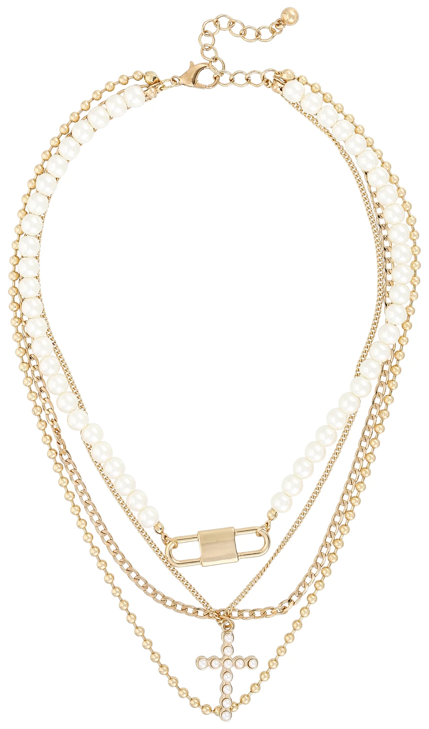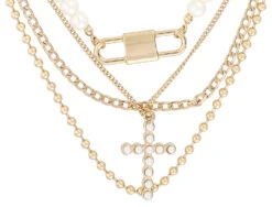 Die Kette – Pearly Layering ist eine goldfarbene Layering Kette die mit Perlen besetzt ist. Das Kreuz setzt den optimalen Hingucker.