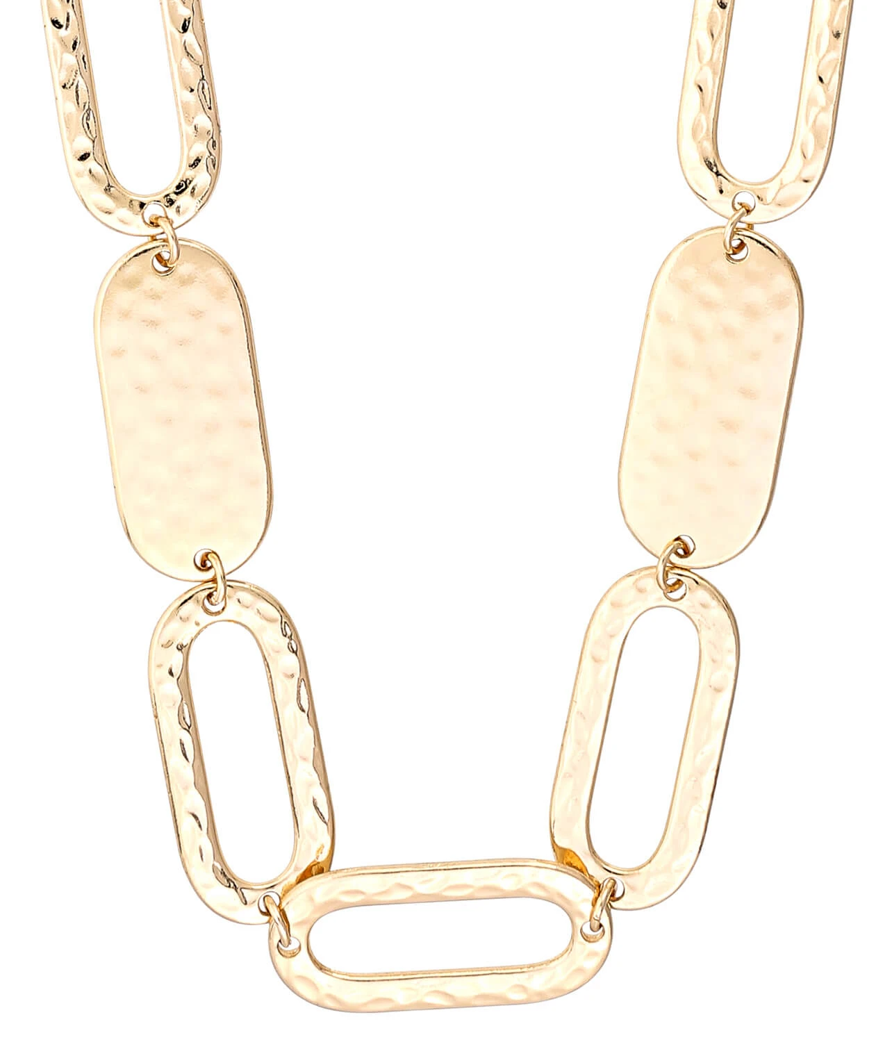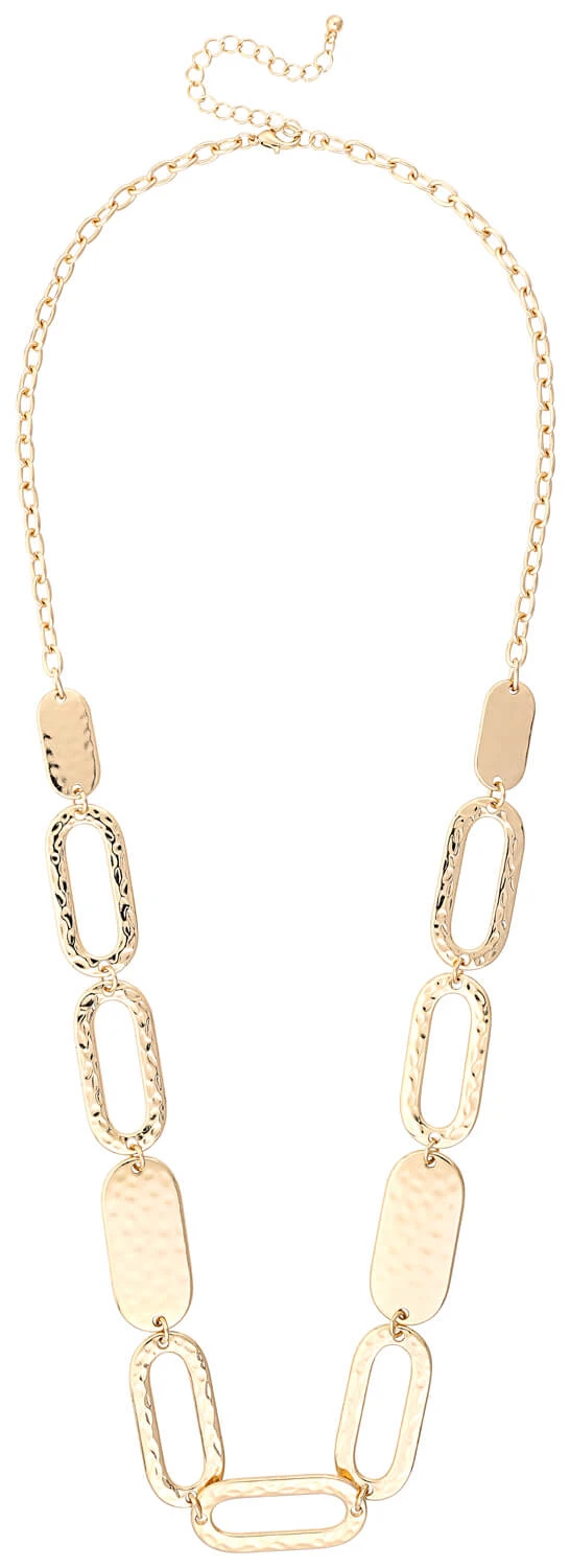 Die Kette – Retro Look in der Farbe Gold besteht aus einer Gliederkette und einer Verlängerung, Die Glieder sind gehämmert.