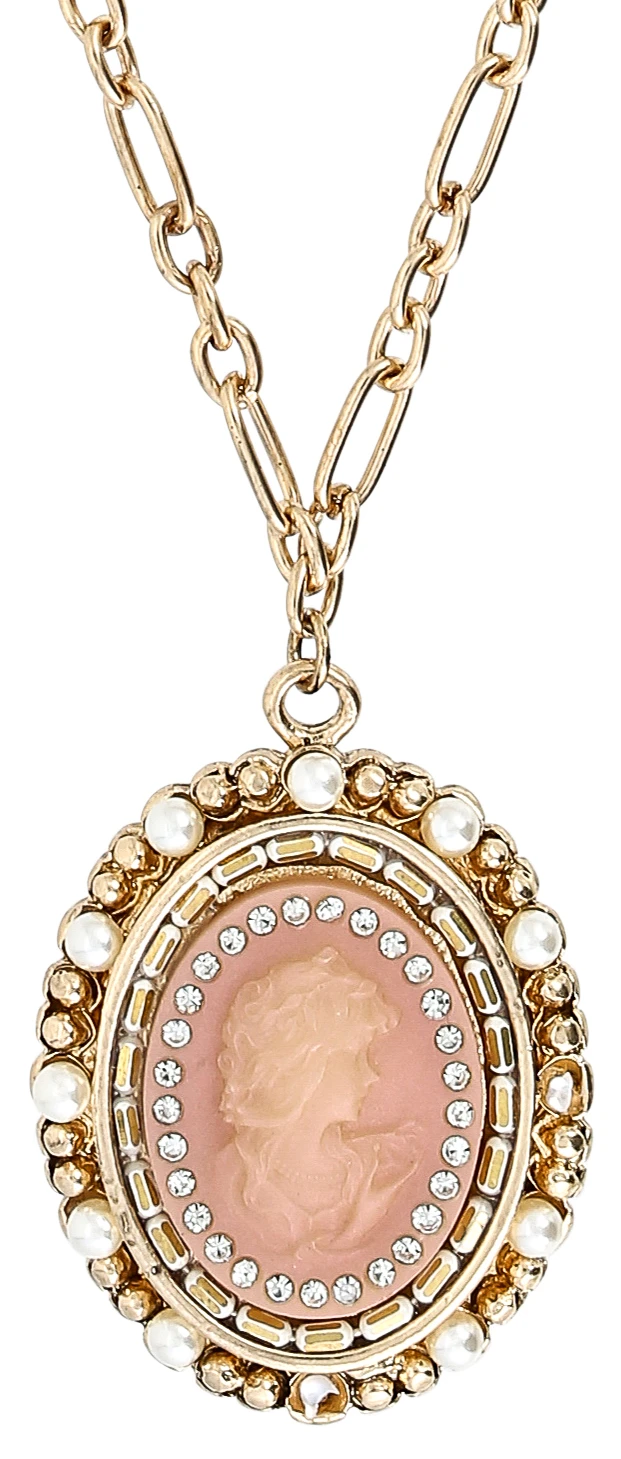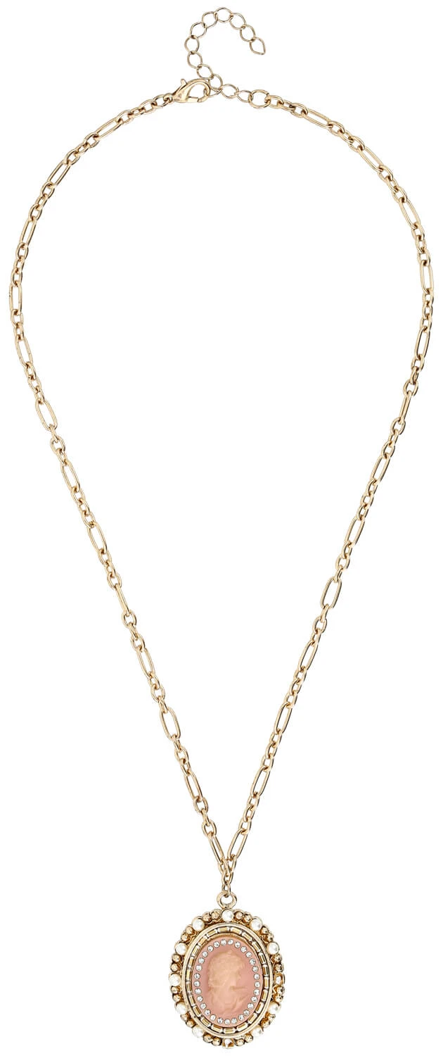 Die Kette – Romantic Style ist goldfarben mit einem ovalen Anhänger, der mit Perlen verziert ist. Auf dem Anhänger befindet sich ein Gesicht auf rosèfarbenem Hintergrund.