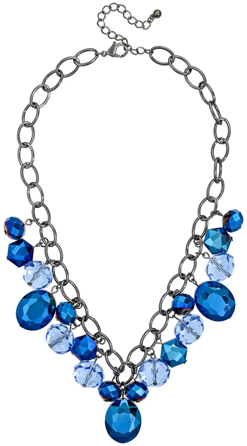 Die Kette – Round Beads schimmert dunkelgrau und hat eine Hämatit-Beschichtung. Die Glasperlen sind facettiert und haben verschiedene Blautöne. Die Statement Kette hat eine Verlängerungskette.