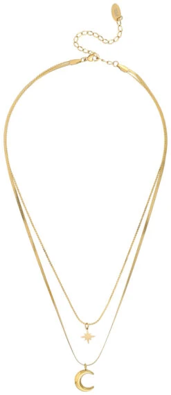 Die Kette – Shiny Moon ist goldfarben und besteht aus Edelstahl. Die Kette besteht aus zwei Reihen Schlangenketten, die Ketten sind mit Anhängern in Mond- und Sternenform verziert.