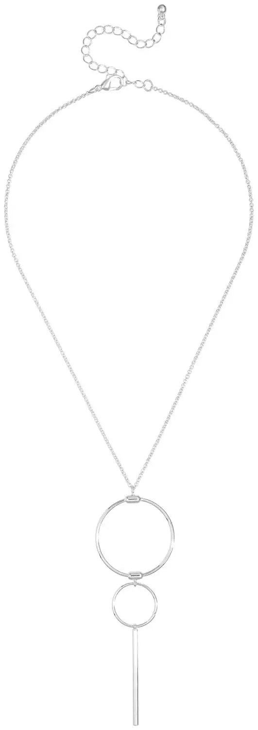 Die Kette – Silver Bar schimmert silberfarben und besteht zu 50% aus recyceltem Messing. Die Gliederkette hat einen Anhänger und eine Verlängerungskette. Der Anhänger besteht aus zwei miteinander verbundenen Kreisen und einem langen Stab.