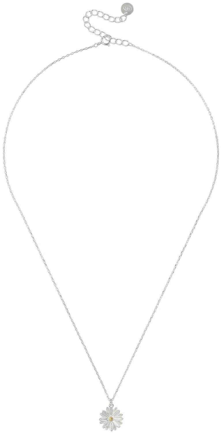 Die Kette – Silver Daisy schimmert silberfarben und besteht aus 925er Echtsilber. Die Kette hat eine Verlängerungskette und hat einen Anhänger in der Form einer Blume. Die Kette ist eine Gliederkette.