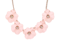 Die Kette – Soft Flower schimmert rosĂ©goldfarben und hat fĂĽnf Blumen in der Mitte. Die Blumen sind rosa und haben eine matte Oberfläche. Die Mitte der Blumen ist mit weiĂźen Kunstperlen verziert.
