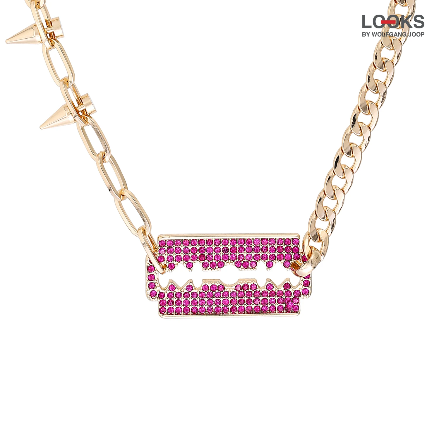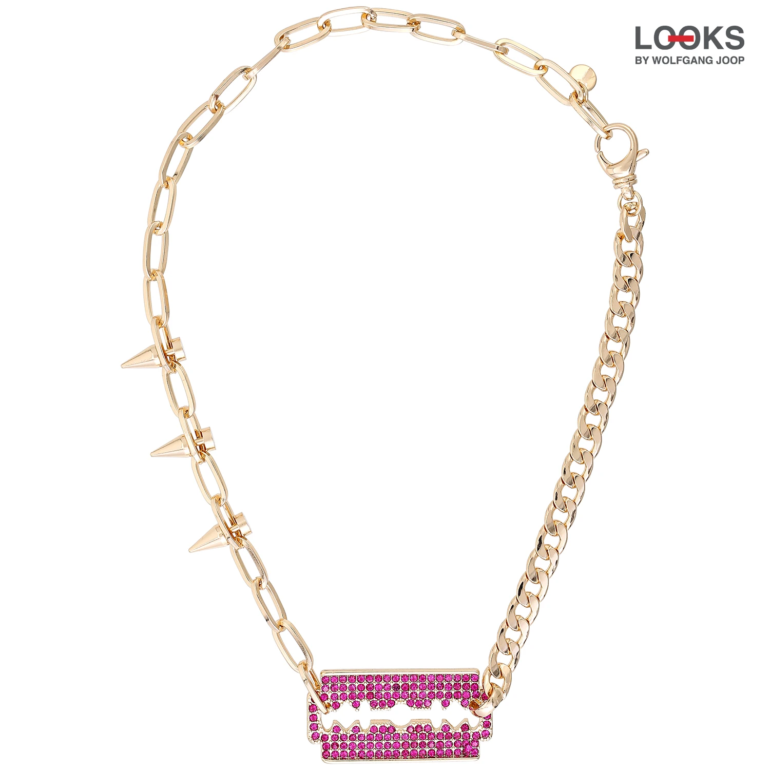 Die Kette – Sparkling Razor schimmert goldfarben und hat einen Anhänger in der Form einer Rasierklinge. Die Rasierklinge ist mit pinken Strasssteinen verziert. Die Kette besteht aus zwei verschiedenen Gliederkette, wobei eine mit drei Stacheln verziert ist, jetzt entdecken in der LOOKS by Wolfgang Joop Kollektion von Bijou Brigitte!