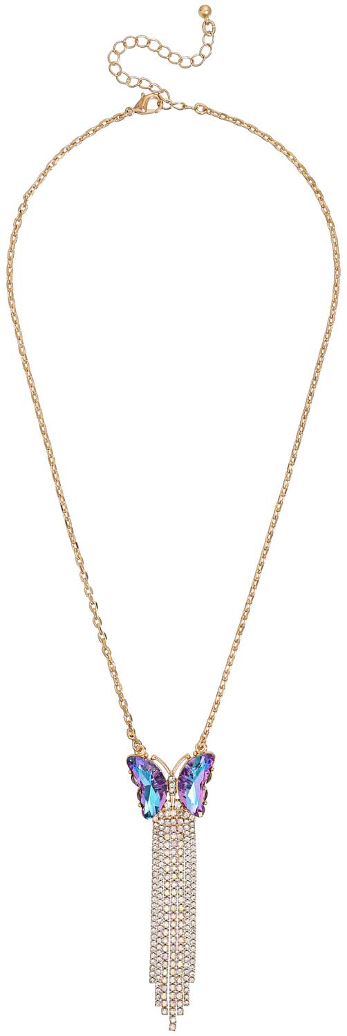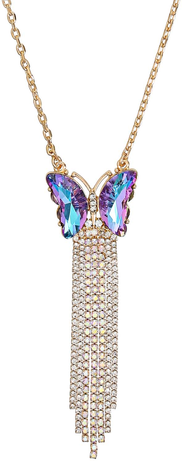 Die Kette – Sparkling Waterfall schimmert goldfarben und ist mit einem Anhänger in der Form eines Schmetterlings verziert. Der Schmetterling ist mit Strasssteinen geschmĂĽckt, welche lila und blau schimmern.