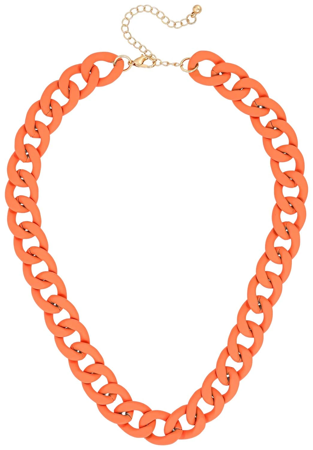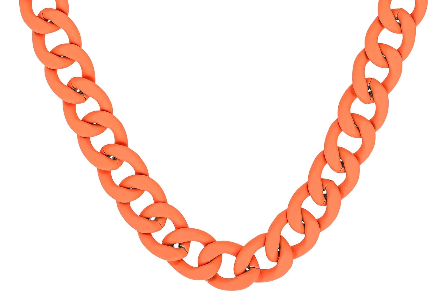 Die Kette – Statement Orange ist eine Gliederkette und ist in einem matten, knalligen Orange. Durch die Verlängerungskette ist die Länge der Kette verstellbar.
