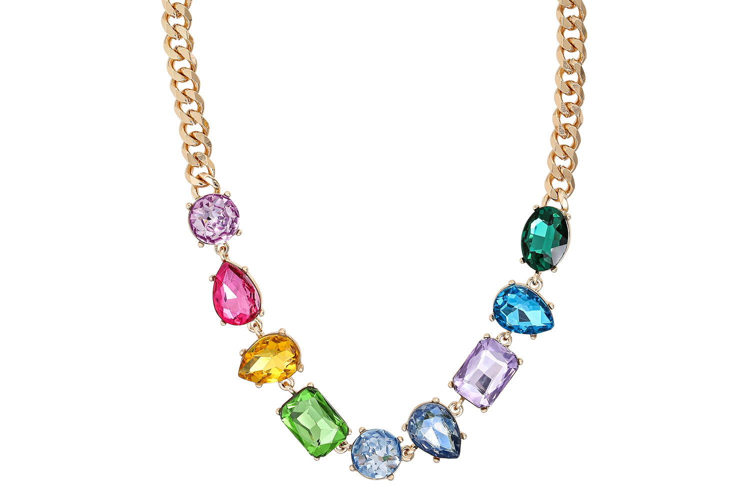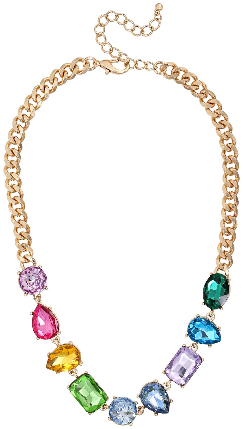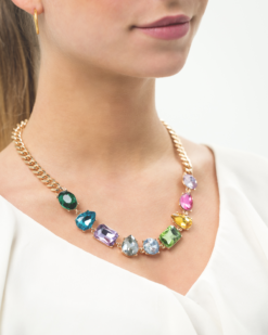 Die Kette – Strass Rainbow schimmert goldfarben und ist mit Strasssteinen verziert. Die Strasssteine haben unterschiedliche Formen und die Farben eines Regenbogens. Die Panzerkette hat eine Verlängerungskette.