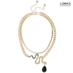 Das Ketten-Set – Diamond Snake besteht aus zwei goldfarbenen Ketten. Eine Kette wird von einem Anhänger in der Form einer Schlange und grĂĽnen Strasssteinen verziert.
