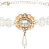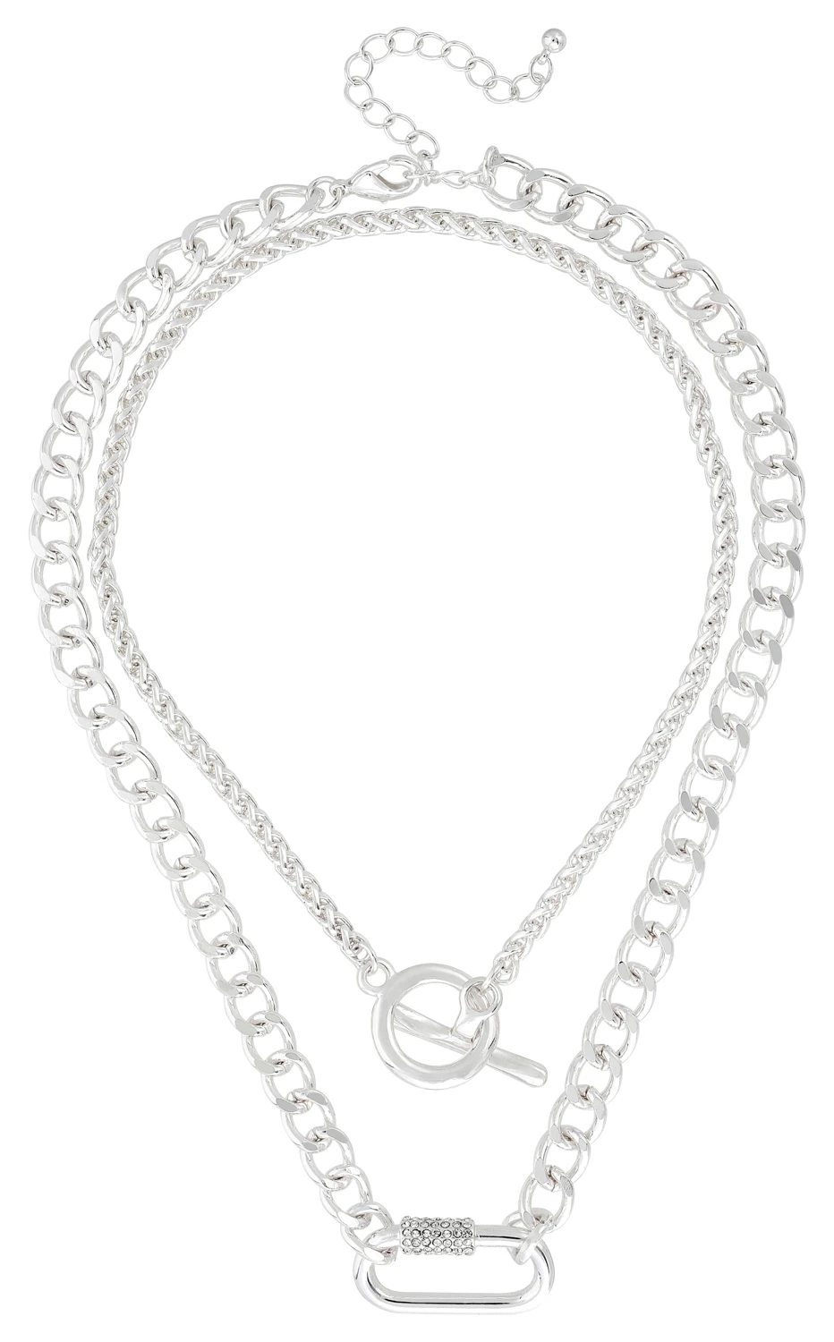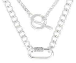 Das Ketten-Set – Double Chain in der Farbe Silber besteht aus zwei Ketten. Die Gliederkette hat ein größeres Glied in der Mitte, welches mit Glaskristallen verziert ist.