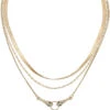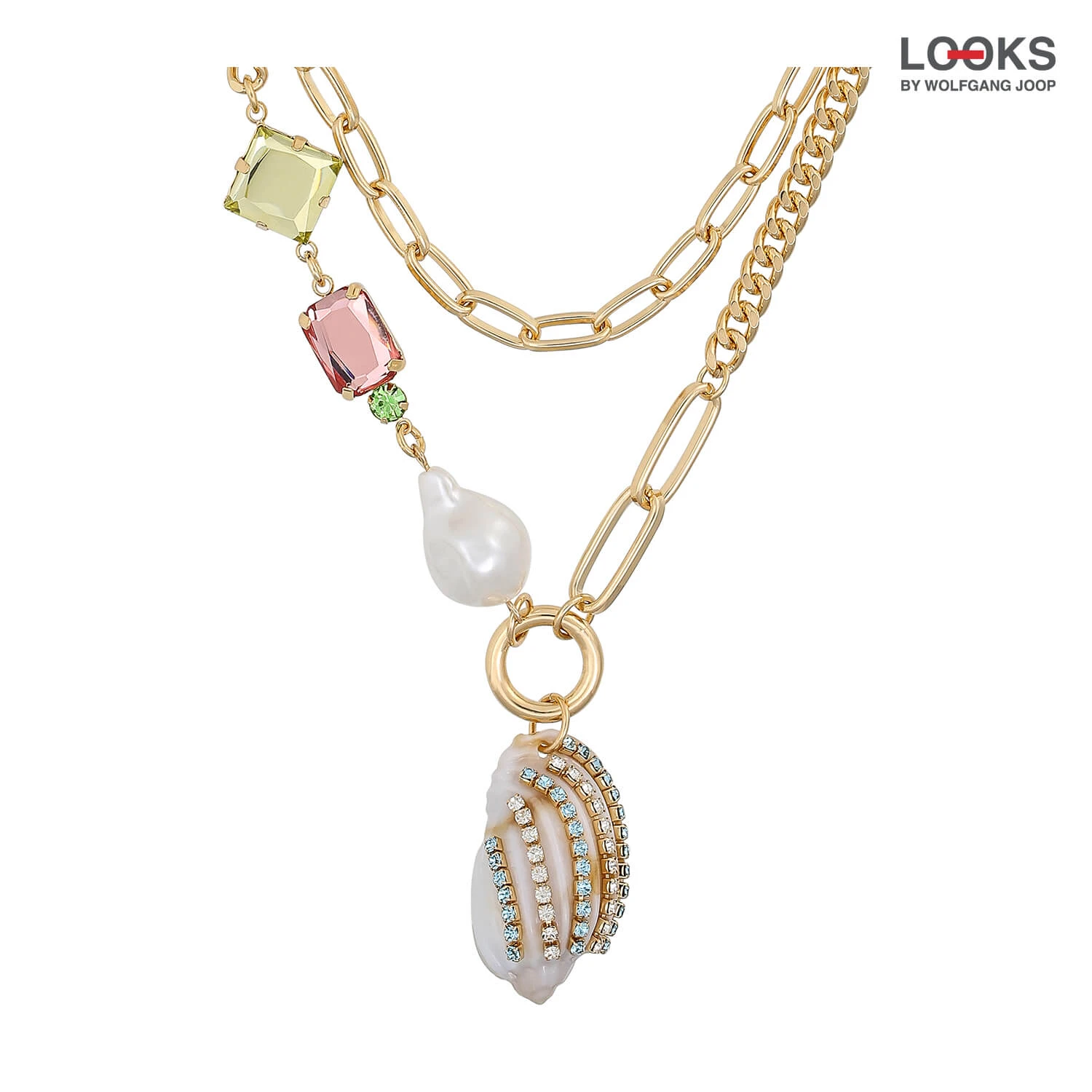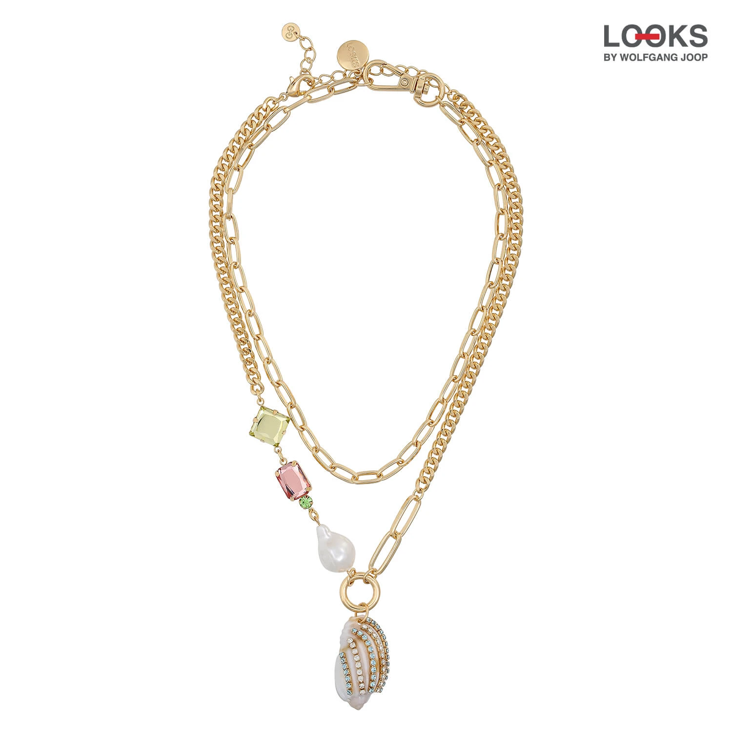 Das Ketten-Set – Glitter Shell schimmert goldfarben und besteht aus zwei Ketten in unterschiedlichen Designs. Eine Kette hat einen Anhänger in der Form einer Muschel und ist mit einer Kunstperle verziert. Die Muschel ist mit Strasssteinen geschmĂĽckt.