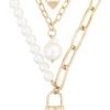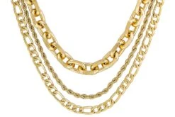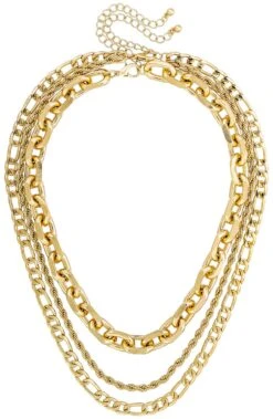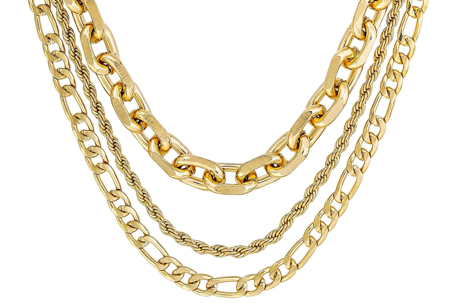 Das Ketten-Set – Golden Classic schimmert goldfarben und besteht aus zwei Ketten in unterschiedlichen Designs. Eine Kette ist eine Layering Kette mit zwei verschiedenen Reihen. Die andere Kette ist eine groĂźe Gliederkette. Beide haben eine Verlängerungskette.
