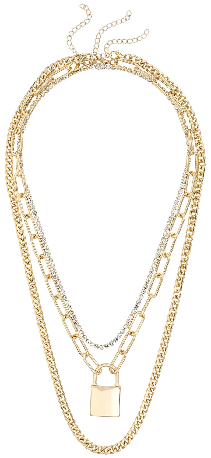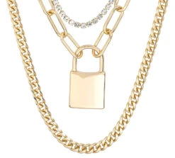 Das Ketten-Set – Golden Lock schimmert in goldfarben und besteht aus drei Ketten. Eine Kette ist mit einem Anhänger in Schlossform verziert und eine Kette mit Strasssteinen.