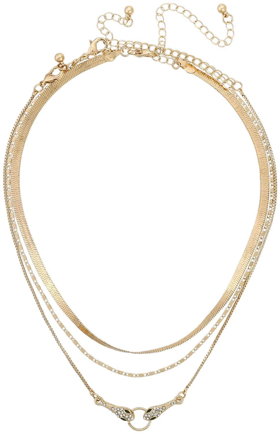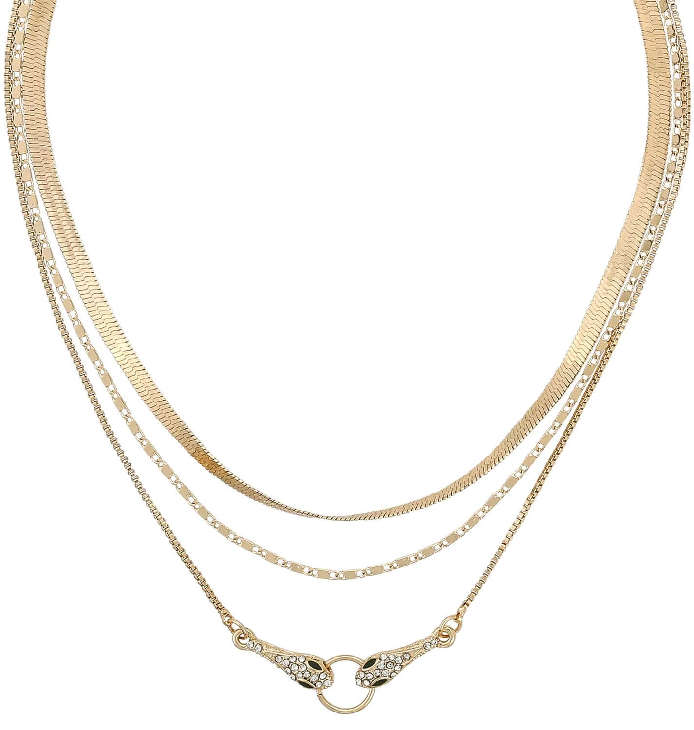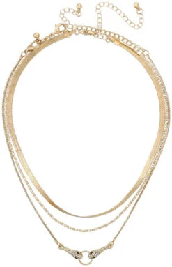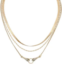 Das Ketten-Set – Golden Snakes besteht aus drei goldfarbenen Ketten in verschiedenen Designs. Zwei Ketten sind Gliederketten und eine ist eine Schlangenkette. Eine Kette hat zwei Anhänger in der Form einer Schlange, welche mit Strasssteinen verziert sind.