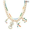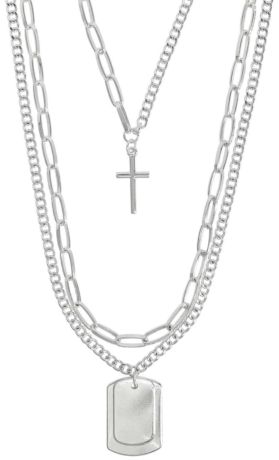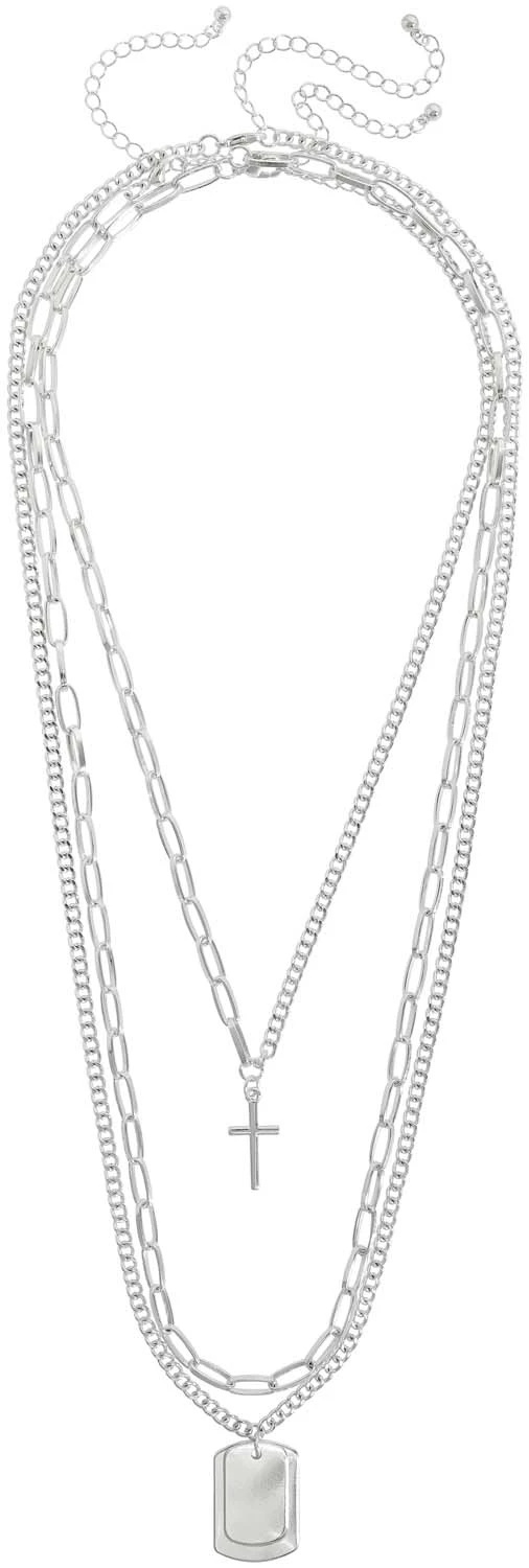 Das Ketten-Set – Silver Cross schimmert silberfarben und besteht aus drei Ketten in unterschiedlichen Designs. Zwei Ketten haben einen Anhänger: ein Kreuz und glänzende Plättchen. Die Ketten sind Gliederketten.
