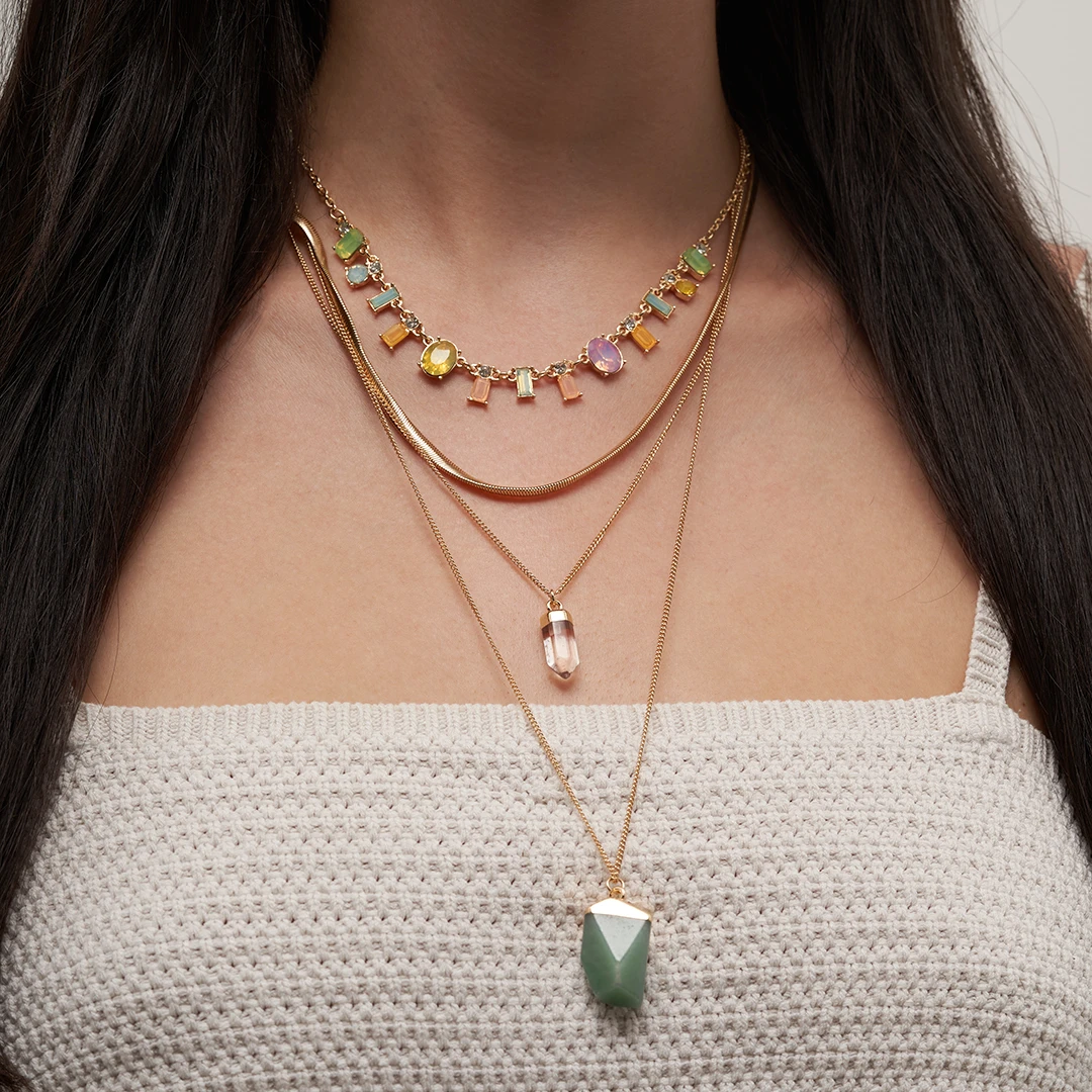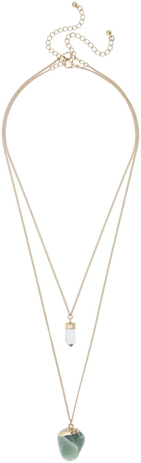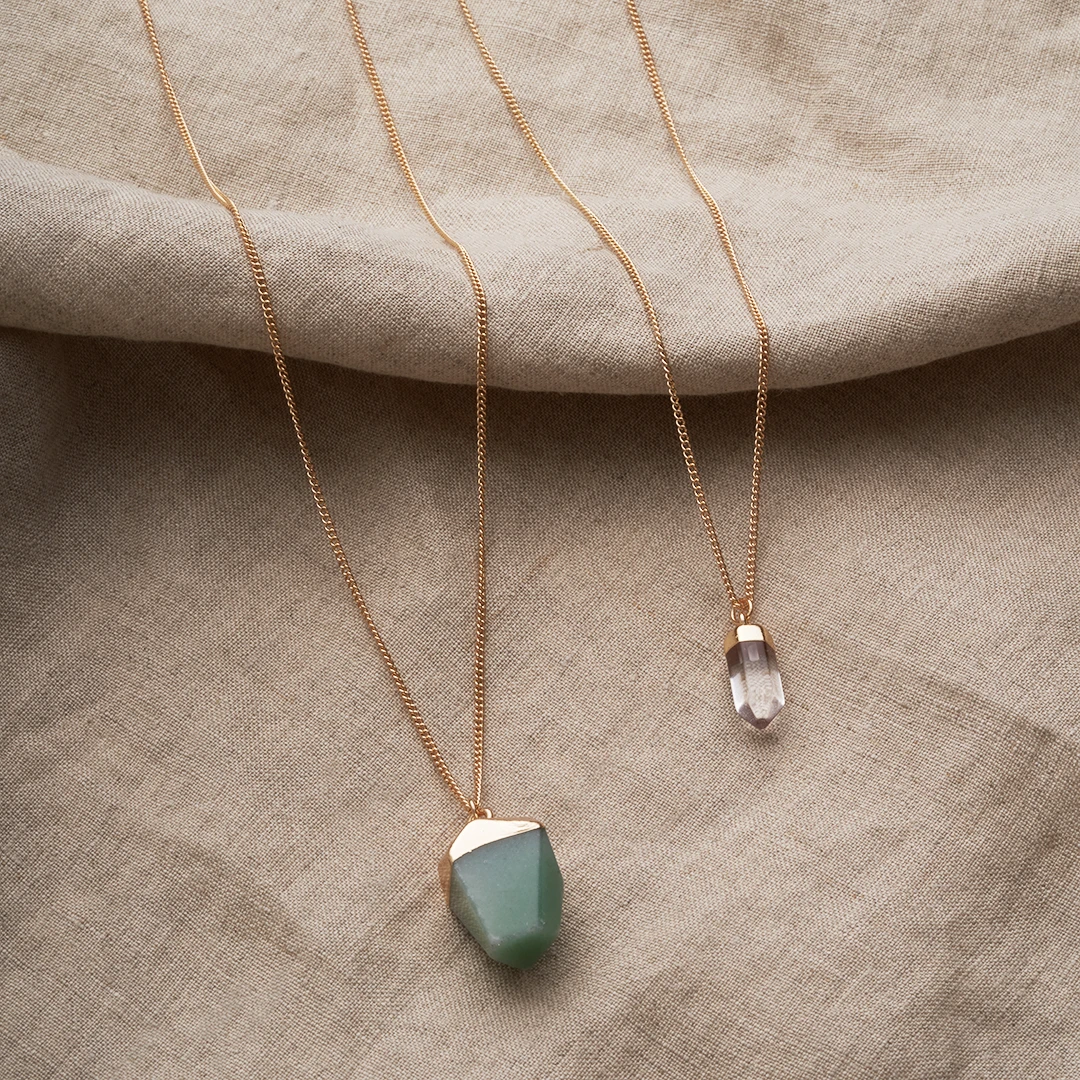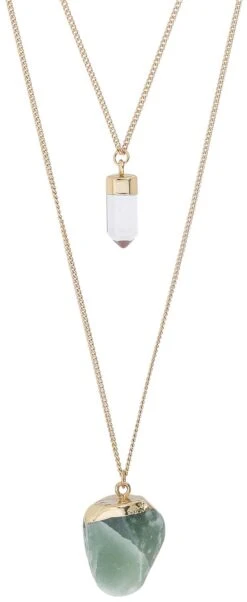 Das Ketten-Set – Summer Gem besteht aus zwei Ketten in unterschiedlichen Designs. Die Ketten haben beide einen Anhänger, welcher aus dem echten Edelstein Quarz und Aventurine besteht. Die Ketten haben eine Verlängerungskette.
