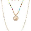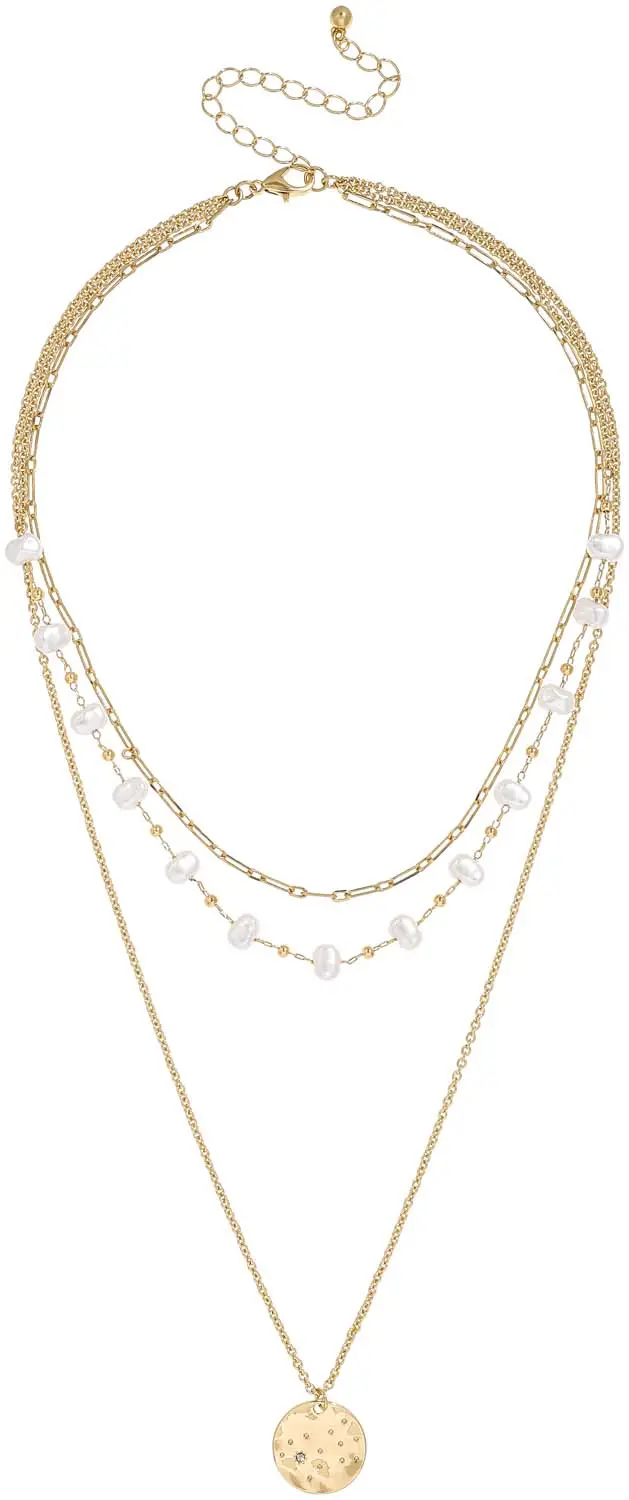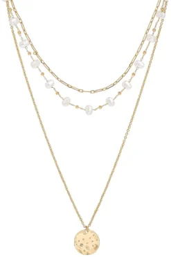 Die Layering Kette – Beach Pearls schimmert goldfarben und besteht aus drei Reihen Ketten in unterschiedlichen Designs. Eine Reihe ist mit weiĂźen Kunstperlen verziert und die andere mit einem Anhänger. Der Anhänger ist mit funkelnden Strasssteinen geschmĂĽckt.
