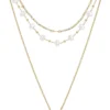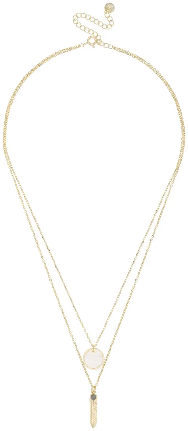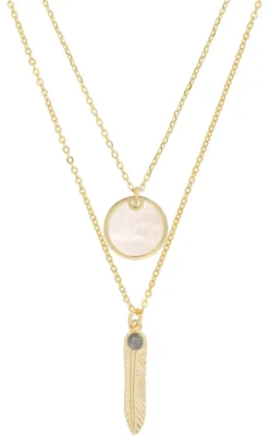 Die Layering Kette – Classic Feather schimmert goldfarben und besteht aus 925er Echtsilber. Die zwei Reihen haben jeweils einen Anhänger. Die Anhänger sind mit den echten Edelsteinen Aventurin und Mother of Pearl verziert.