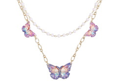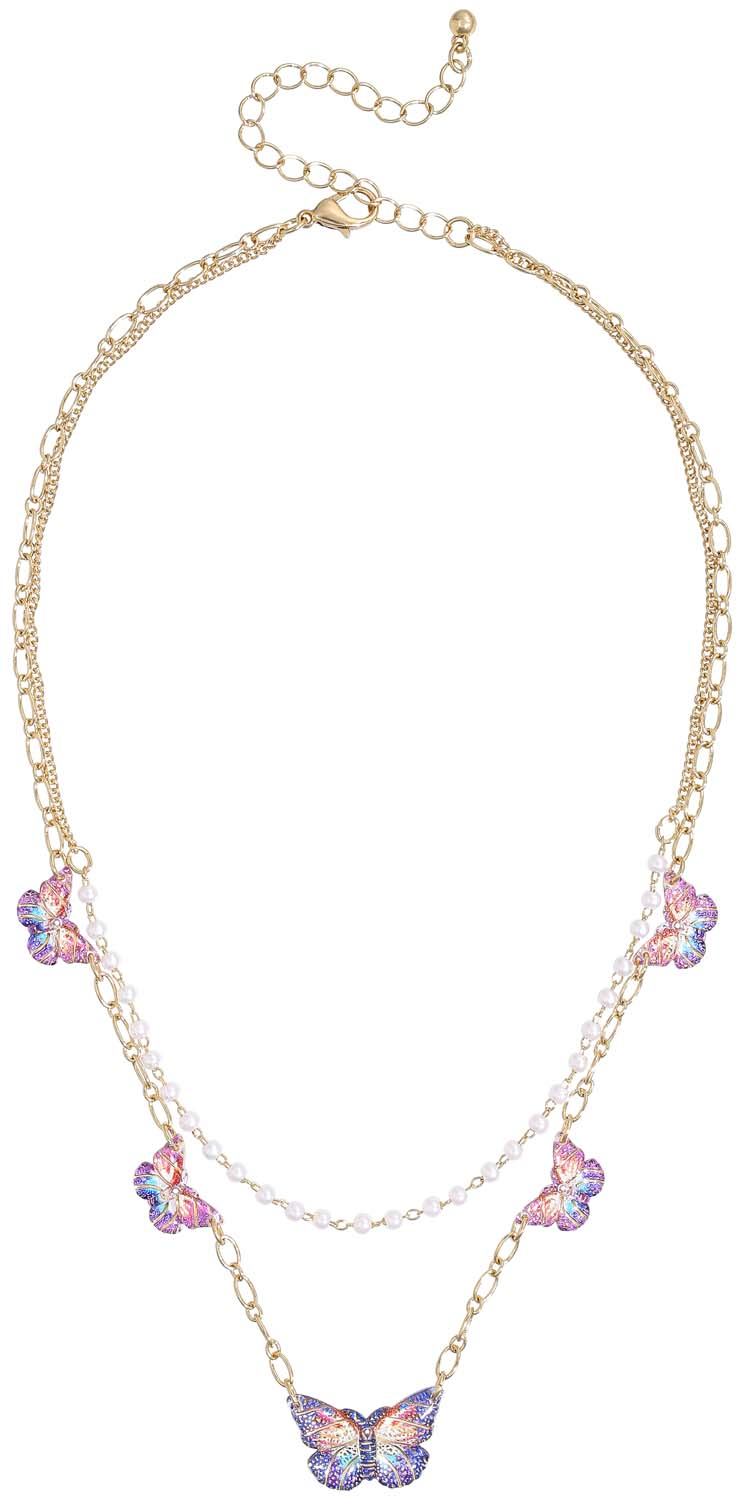 Die Layering Kette – Dreamy Nature schimmert goldfarben und besteht aus zwei Reihen Ketten in unterschiedlichen Designs. Die obere Reihe ist mit weiĂźen Kunstperlen verziert. Die untere Reihe hat drei Schmetterlings-Anhänger.
