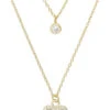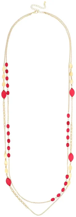 Die Layering Kette – Fuchsia Statement schimmert goldfarben und besteht aus zwei Reihen Ketten in ähnlichen Designs. Die Reihen sind mit goldfarbenen Plättchen und pinken Elementen verziert.