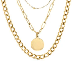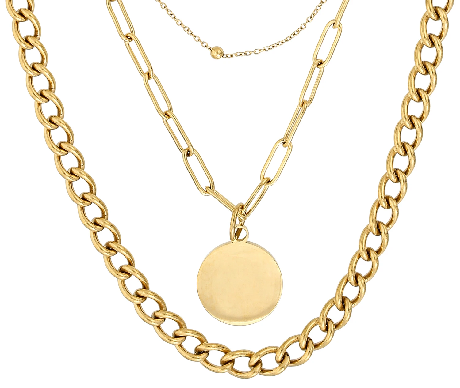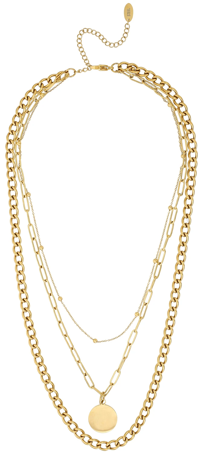 Die Layering Kette – Golden Circle besteht aus Edelstahl und ist goldfarben. Die Kette besteht aus drei Reihen Gliederketten und wird von einem kreisförmigen Anhänger verziert.