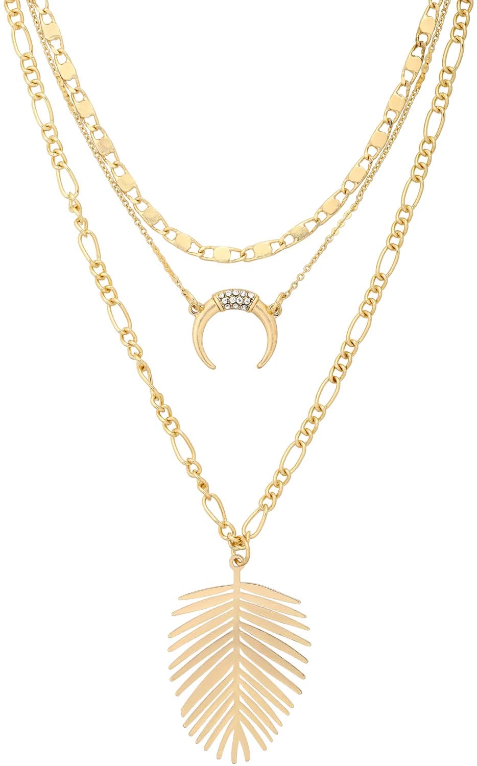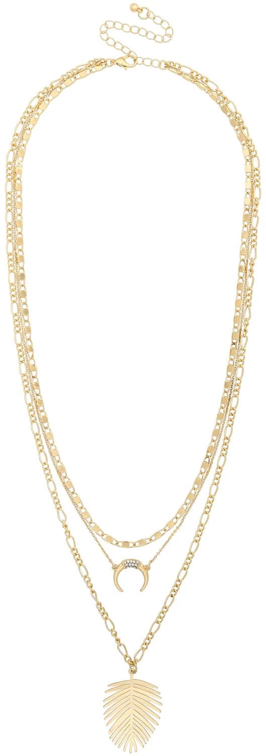 Die Layering Kette – Golden Leaf schimmert goldfarben und besteht aus drei Reihen Ketten in unterschiedlichen Designs. Die Kette hat zwei Anhänger, welche die Form eines Halbmondes und eines Blattes haben. Der Halbmond ist mit Strasssteinen verziert.
