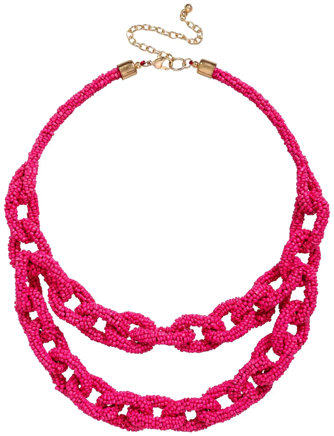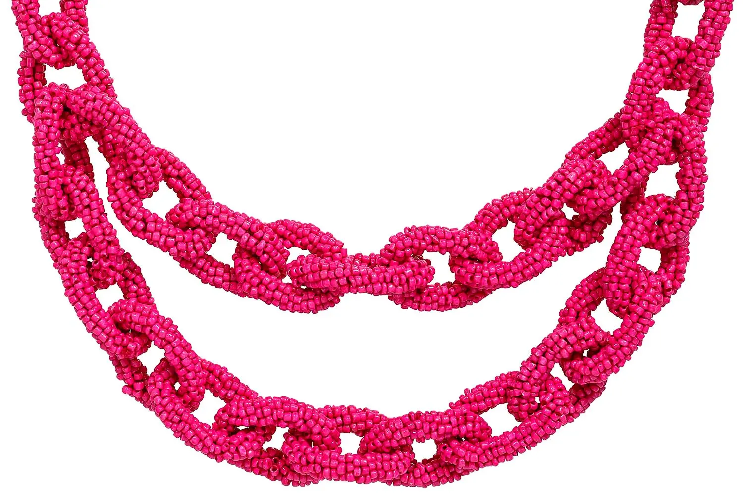 Die Kette – Magical Fuchsia hat zwei Reihen und besteht aus vielen pinken Glasperlen, die ineinander verflochten sind. Die Glasperlen bilden einzelne Glieder, welche miteinander zusammenhängen und somit einer Ankerkette ähneln. Die Kette ist ein wahres Statement Accessoire und zieht alle Blicke auf sich.