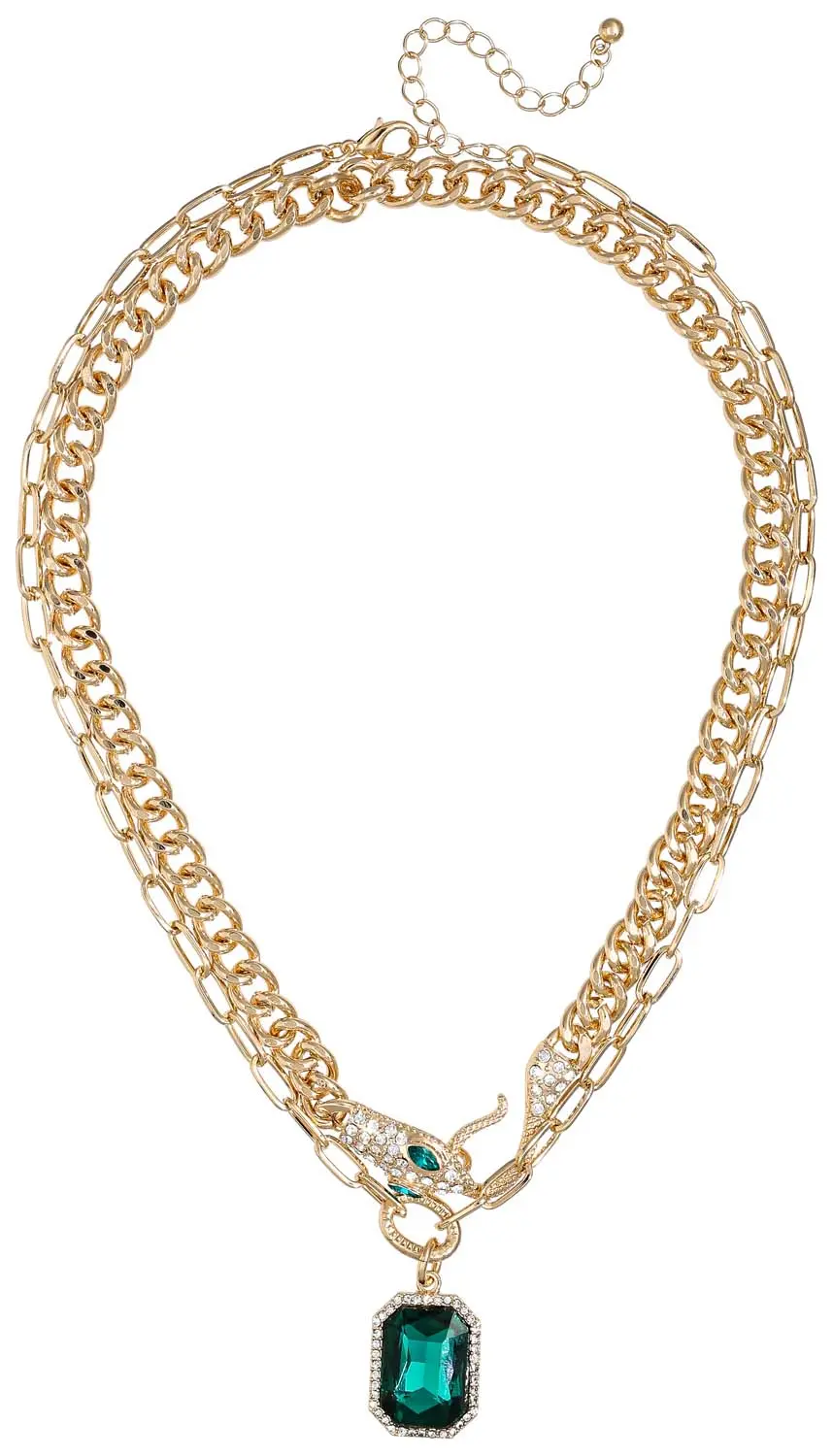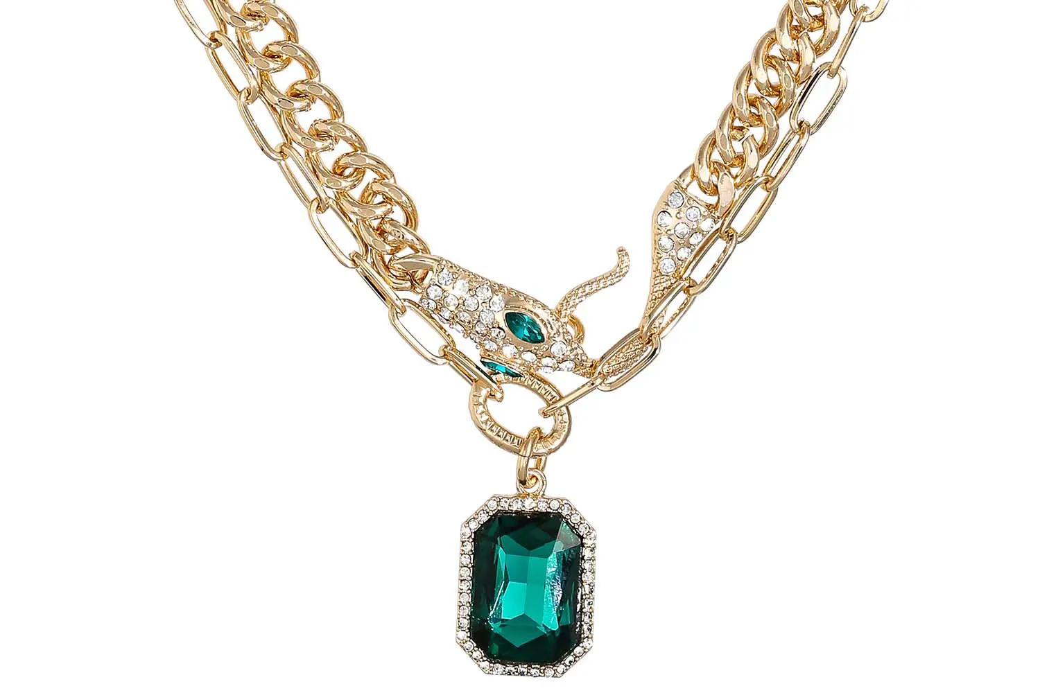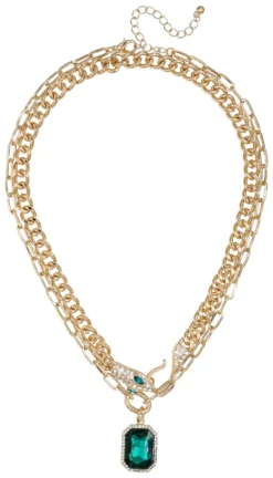 Die Layering Kette – Mystic Snake schimmert goldfarben und besteht aus zwei Reihen Ketten in unterschiedlichen Designs. Die obere Reihe hat die Form einer Schlange, die mit funkelnden Strasssteinen verziert ist. Die untere Reihe hat einen rechteckigen Anhänger.