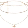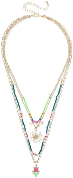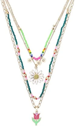 Die Layering Kette – Radiant Flower besteht aus vier Reihen Ketten in unterschiedlichen Designs. Einige Reihen der Kette haben Anhänger in der Form von verschiedenen Blumen und kleinen Kreisen. Die Anhänger sind teilweise mit Strasssteinen verziert.