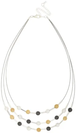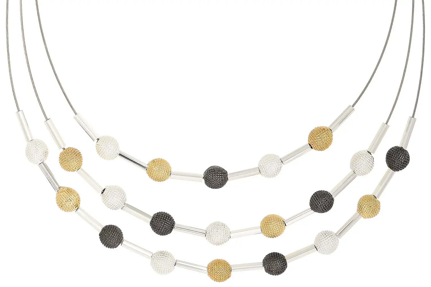 Die Layering Kette – Rough Bullets besteht aus drei Reihen Ketten in den gleichen Designs. Alle drei Reihen sind mit schwarzen, silberfarbenen und goldfarbenen Kugeln verziert. Die Statement-Kette hat eine Verlängerungskette.