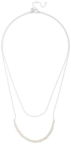 Die Layering Kette – Shimmering Pearl besteht aus Edelstahl und hat zwei Reihen Ketten in verschiedenen Designs. Die Kette ist eine Kugelkette und besteht aus 925er Echtsilber. Die untere Reihe ist mit weiĂźen SĂĽĂźwasserperlen verziert.