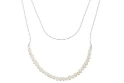 Die Layering Kette – Shimmering Pearl besteht aus Edelstahl und hat zwei Reihen Ketten in verschiedenen Designs. Die Kette ist eine Kugelkette und besteht aus 925er Echtsilber. Die untere Reihe ist mit weiĂźen SĂĽĂźwasserperlen verziert.