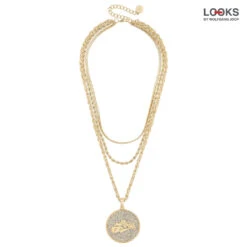 Die Layering Kette – Sparkling Circle besteht aus drei Reihen Ketten und hat einen Anhänger in der Form eines Kreises. Der Anhänger hat die Aufschrift „LOOKS“ und ist mit Strasssteinen verziert.